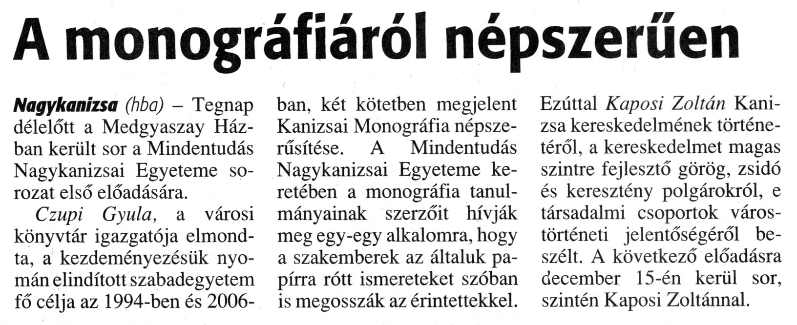 Nyilvános 2585 | 4755 | Zalai Hírlap 2008. november 18. 269. szám 3. oldal - A monográfiáról népszerűen | A cikk szövege: A monográfiáról népszerűen Nagykanizsa (hba) - Tegnap délelőtt a Medgyaszay Házban került sor a Mindentudás Nagykanizsai Egyeteme sorozat első előadására. Czupi Gyula, a városi könyvtár igazgatója elmondta, a kezdeményezésük nyomán elindított szabadegyetem fő célja az 1994-ben és 2006-ban, két kötetben megjelent Kanizsai Monográfia népszerűsítése. A Mindentudás Nagykanizsai Egyeteme keretében a monográfia tanulmányainak szerzőit hívják meg egy-egy alkalomra, hogy a szakemberek az általuk papírra rótt ismereteket szóban is megosszák az érintettekkel. Ezúttal Kaposi Zoltán Kanizsa kereskedelmének történetéről, a kereskedelmet magas szintre fejlesztő görög, zsidó és keresztény polgárokról, e társadalmi csoportok várostörténeti jelentőségéről beszélt. A következő előadásra december 15-én kerül sor, szintén Kaposi Zoltánnal. |