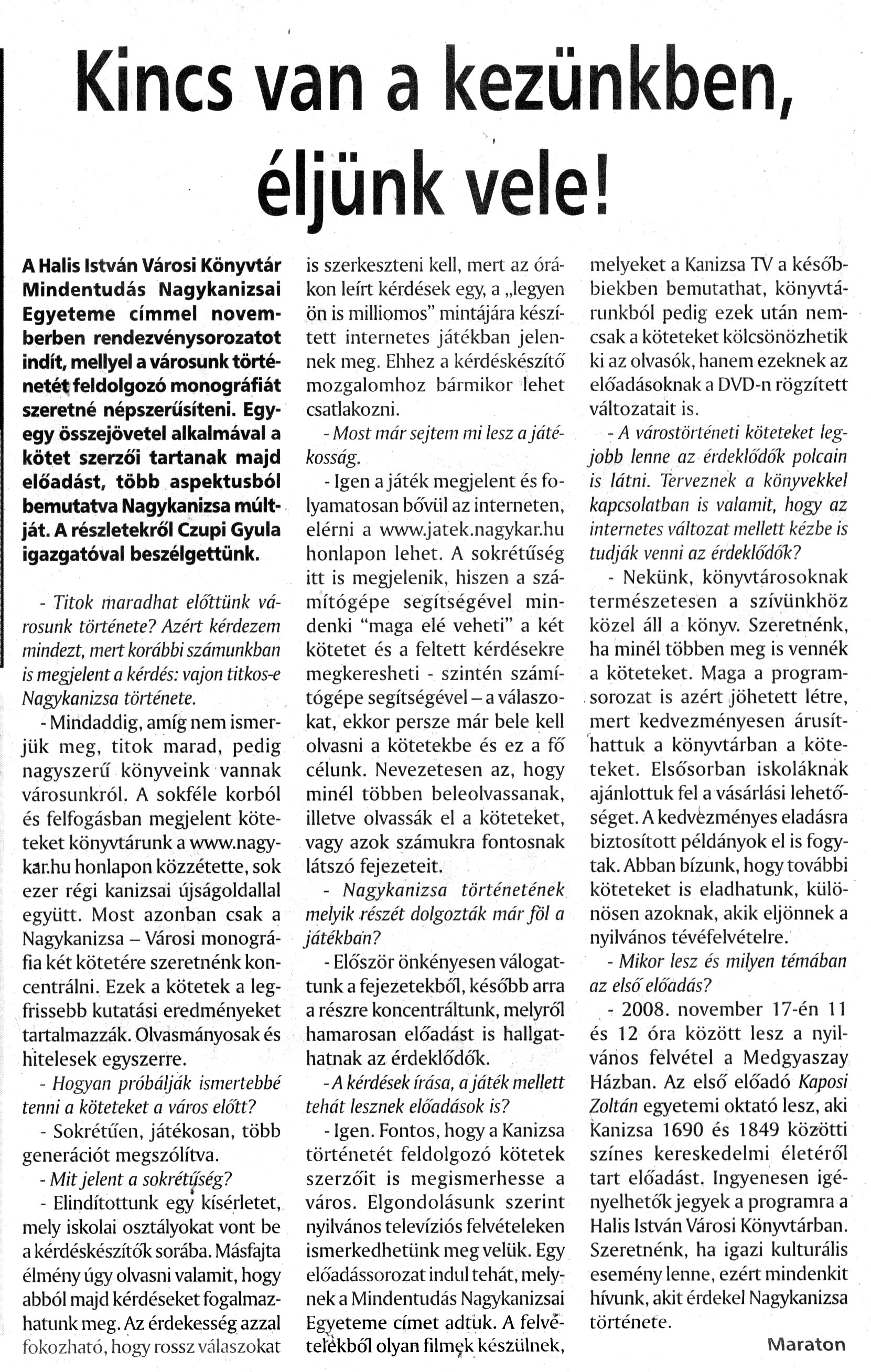 Nyilvános 2563 | 4926 | Nagykanizsai Maraton 2008. november 6. 044. szám 2. oldal - Kincs van a kezünkben, éljünk vele | A cikk szövege: Kincs van a kezünkben, éljünk vele! A Halis István Városi Könyvtár Mindentudás Nagykanizsai Egyeteme címmel novemberben rendezvénysorozatot indít, mellyel a városunk történetét feldolgozó monográfiát szeretné népszerűsíteni. Egy-egy összejövetel alkalmával a kötet szerzői tartanak majd előadást, több aspektusból bemutatva Nagykanizsa múltját. A részletekről Czupi Gyula igazgatóval beszélgettünk. - Titok maradhat előttünk városunk története? Azért kérdezem mindezt, mert korábbi számunkban is megjelent a kérdés: vajon titkos-e Nagykanizsa története. - Mindaddig, amíg nem ismerjük meg, titok marad, pedig nagyszerű könyveink vannak városunkról. A sokféle korból és felfogásban megjelent köteteket könyvtárunk a www.nagy-kar.hu honlapon közzétette, sok ezer régi kanizsai újságoldallal együtt. Most azonban csak a Nagykanizsa - Városi monográfia két kötetére szeretnénk koncentrálni. Ezek a kötetek a legfrissebb kutatási eredményeket tartalmazzák. Olvasmányosak és hitelesek egyszerre. - Hogyan próbálják ismertebbé tenni a köteteket a város előtt? - Sokrétűen, játékosan, több generációt megszólítva. - Mit jelent a sokrétűség? - Elindítottunk egy kísérletet, mely iskolai osztályokat vont be a kérdéskészítők sorába. Másfajta élmény úgy olvasni valamit, hogy abból majd kérdéseket fogalmazhatunk meg. Az érdekesség azzal fokozható, hogy rossz válaszokat is szerkeszteni kell, mert az órákon leírt kérdések egy, a „legyen ön is milliomos" mintájára készített internetes játékban jelennek meg. Ehhez a kérdéskészítő mozgalomhoz bármikor lehet csatlakozni. - Most már sejtem mi lesz a játékosság. - Igen a játék megjelent és folyamatosan bővül az interneten, elérni a www.jatek.nagykar.hu honlapon lehet. A sokrétűség itt is megjelenik, hiszen a számítógépe segítségével mindenki "maga elé veheti" a két kötetet és a feltett kérdésekre megkeresheti - szintén számítógépe segítségével - a válaszokat, ekkor persze már bele kell olvasni a kötetekbe és ez a fő célunk. Nevezetesen az, hogy minél többen beleolvassanak, illetve olvassák el a köteteket, vagy azok számukra fontosnak látszó fejezeteit. - Nagykanizsa történetének melyik részét dolgozták már föl a játékban? - Először önkényesen válogattunk a fejezetekből, később arra a részre koncentráltunk, melyről hamarosan előadást is hallgathatnak az érdeklődők. -A kérdések írása, a játék mellett tehát lesznek előadások is? - Igen. Fontos, hogy a Kanizsa történetét feldolgozó kötetek szerzőit is megismerhesse a város. Elgondolásunk szerint nyilvános televíziós felvételeken ismerkedhetünk meg velük. Egy előadássorozat indul tehát, melynek a Mindentudás Nagykanizsai Egyeteme címet adtuk. A felvételékből olyan filmek készülnek, melyeket a Kanizsa TV a későbbiekben bemutathat, könyvtárunkból pedig ezek után nemcsak a köteteket kölcsönözhetik ki az olvasók, hanem ezeknek az előadásoknak a DVD-n rögzített változatait is. - A várostörténeti köteteket legjobb lenne az érdeklődők polcain is látni. Terveznek a könyvekkel kapcsolatban is valamit, hogy az internetes változat mellett kézbe is tudják venni az érdeklődők? - Nekünk, könyvtárosoknak természetesen a szívünkhöz közel áll a könyv. Szeretnénk, ha minél többen meg is vennék a köteteket. Maga a programsorozat is azért jöhetett létre, mert kedvezményesen árusíthattuk a könyvtárban a köteteket. Elsősorban iskoláknak ajánlottuk fel a vásárlási lehetőséget. A kedvezményes eladásra biztosított példányok el is fogytak. Abban bízunk, hogy további köteteket is eladhatunk, különösen azoknak, akik eljönnek a nyilvános tévéfelvételre. - Mikor lesz és milyen témában az első előadás? - 2008. november 17-én 11 és 12 óra között lesz a nyilvános felvétel a Medgyaszay Házban. Az első előadó Kaposi Zoltán egyetemi oktató lesz, aki Kanizsa 1690 és 1849 közötti színes kereskedelmi életéről tart előadást. Ingyenesen igényelhetők jegyek a programra a Halis István Városi Könyvtárban. Szeretnénk, ha igazi kulturális esemény lenne, ezért mindenkit hívunk, akit érdekel Nagykanizsa története. Maraton |